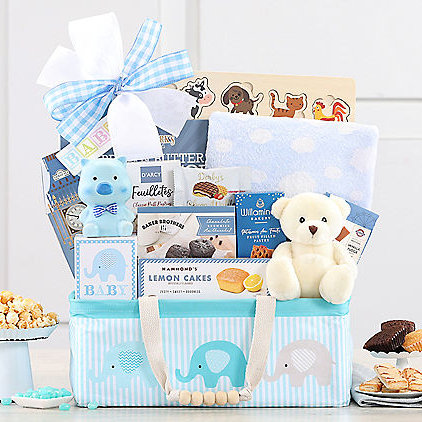 Perfect for a baby boy shower or to welcome mom and her precious new baby back home. A soft plush bear, blue blanket, wooden puzzle, piggy bank, vanilla fudge, chocolate cookies, English tea, brownies, Jelly Belly jelly beans and much more will get them off to a good start.