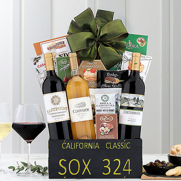 They'll be California dreaming with this unique metal box filled with three California wines: Cliffside pinot grigio, Eastpoint cabernet sauvignon and Edenbrook Vineyards merlot. A collection of Vine e Formaggio smoked Gouda cheese spread, Lindt Lindor milk chocolate truffle balls, olives and more completes this California wine gift.