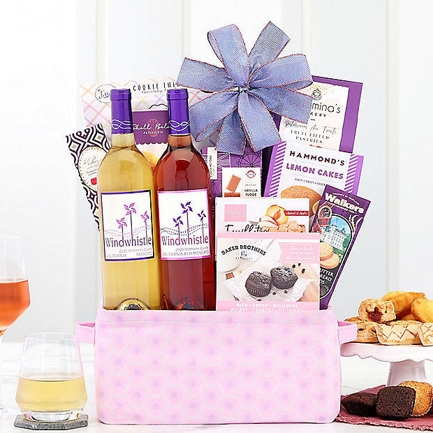 They'll love this fun gift tote filled with Windwhistle moscato with vivid peach and melon flavors, and red moscato brimming with juicy cherry and raspberry flavors, along with a collection of chocolate cookies, Shell Bella madeleine cakes, Hammond's lemon cakes, Baker Brothers chocolate brownies, Le Preziose fruit jellies and much more.