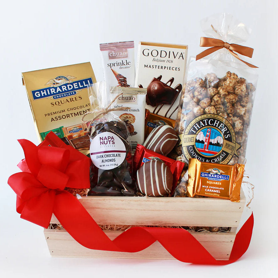 Indulge in a chocolate lover's dream with our Chocolate Dreams gift crate. This assortment includes creamy Ghirardelli Squares, milk chocolate Godiva bar, chocolate and peanut butter sandwich cookies, Chuao mini bars, cookies and cream popcorn, and rich chocolate almonds. Treat yourself or a loved one to a decadent and delicious experience.