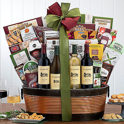 Duckhorn Vineyards Napa Valley cabernet sauvignon has aromas of black raspberry, vanilla bean and milk chocolate; chardonnay showcases Bosc pear and apple flavors. Merlot, with notes of plum, violet and sticky toffee, and crisp sauvignon blanc with layers of grapefruit, summer melon and lemongrass complete this fine Napa Valley quartet. Sonoma Jacks garlic and herb cheese spread, Godiva milk chocolate covered raisins, mixed olives, lemon cakes and plenty more make this gift so fun to open and share.