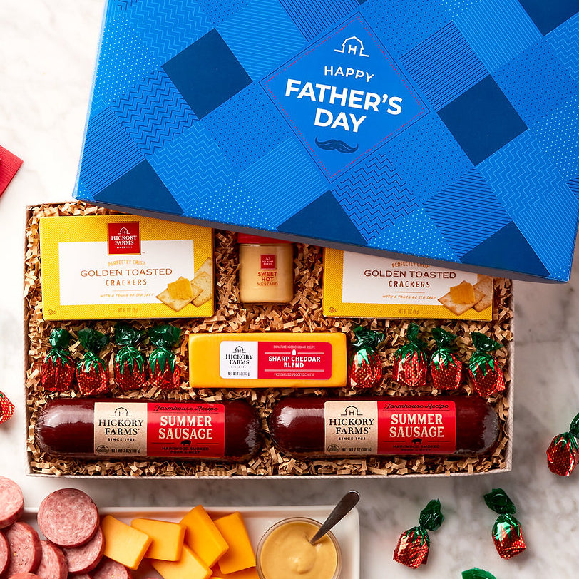 Dad deserves all the tastiest Hickory Farms classics in this timeless gift just for him. Farmhouse Summer Sausage, Sharp Cheddar Blend, Sweet Hot Mustard, and crispy Golden Toasted Crackers all stack up to the perfect bite every time. There's even classic Strawberry Bon Bons to make his day delicious. ​The gift comes with a Happy Father’s Day lid, so he knows he doesn’t have to share!