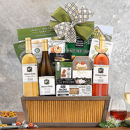 Hobson Estate cabernet with raspberry flavors and dark chocolate accents, pinot noir with cherry and strawberry flavors, and rose with its refreshing hints of melon and citrus are paired with a complementary collection that includes walnut cookies, crackers, honey mustard sourdough pretzel, smoked Gouda cheese spread, basil thyme artichoke snacks, Lindt milk chocolate truffles and more to complete this outstanding California wine gift basket.