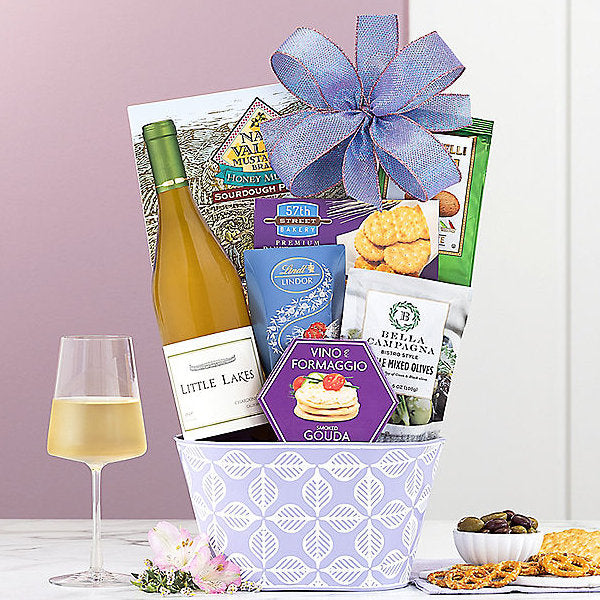 Little Lakes Cellars chardonnay and a collection of Wine Country favorites including honey mustard sourdough pretzels, milk chocolate truffles, cookies, crackers, cheese spread and olives are brought together for this classic California chardonnay basket.