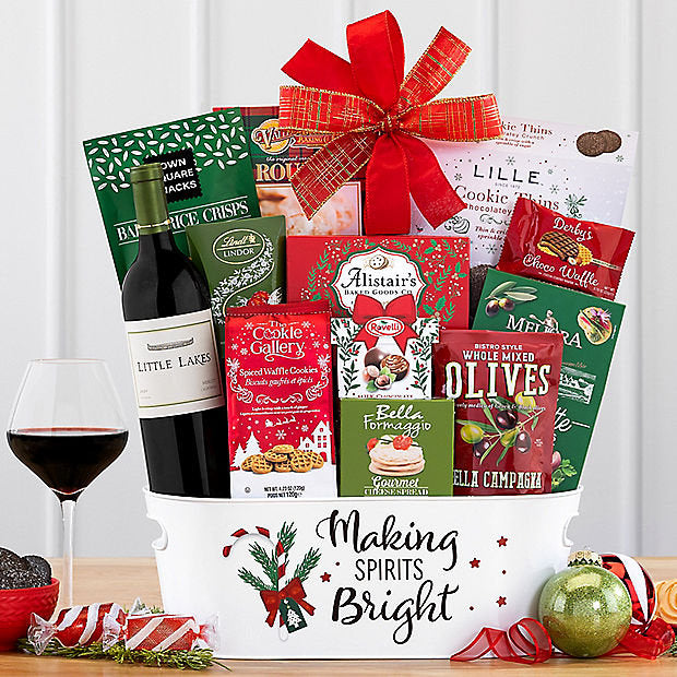 California's Little Lakes Cellars merlot has plum and berry flavors with a hint of chocolate. A varied assortment of Lille chocolate cookies, garlic herb crackers, smoked Gouda cheese spread, paprika garlic rice crisps, Lindt milk chocolate truffles, milk chocolate hazelnut pralines, spiced waffle cookies, sesame crackers, shortbread cookies, olives, a strawberry chocolate waffle cookie and more completes this holiday wine basket.