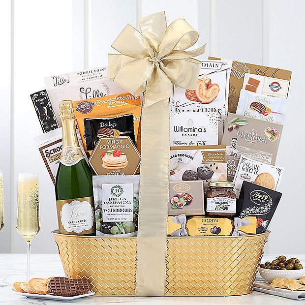 This refined champagne gift basket with Kiarna sparkling grand cuvee is made for celebrating. A collection of Godiva dark chocolate ganache hearts, Vine e Formaggio smoked Gouda cheese spread, Bella Campagna mixed olives, chocolate brownies, Willamina's Bakery fruit pastries and more completes this sparkling gift collection.
