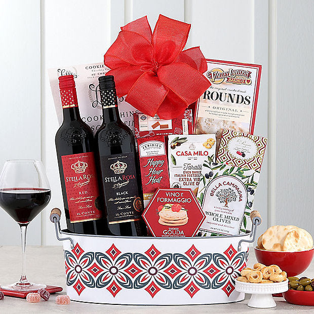 Stella Rosa produces two of America's favorite semi-sweet, lightly carbonated wines. This basket includes Stella Rosa Red with sweet strawberry flavors, and Black with sultry semi-sweet ripe blackberry, blueberry and raspberry flavors. Vine e Formaggio smoked Gouda cheese spread, Lille chocolate cookie thins, Feridies spicy snack mix, Le Preziose fruit jellies and more round out this lovely wine gift basket. Brought to you from a tiny town in northern Italy where everyone is drinking smooth, sweeter sparkling wines.