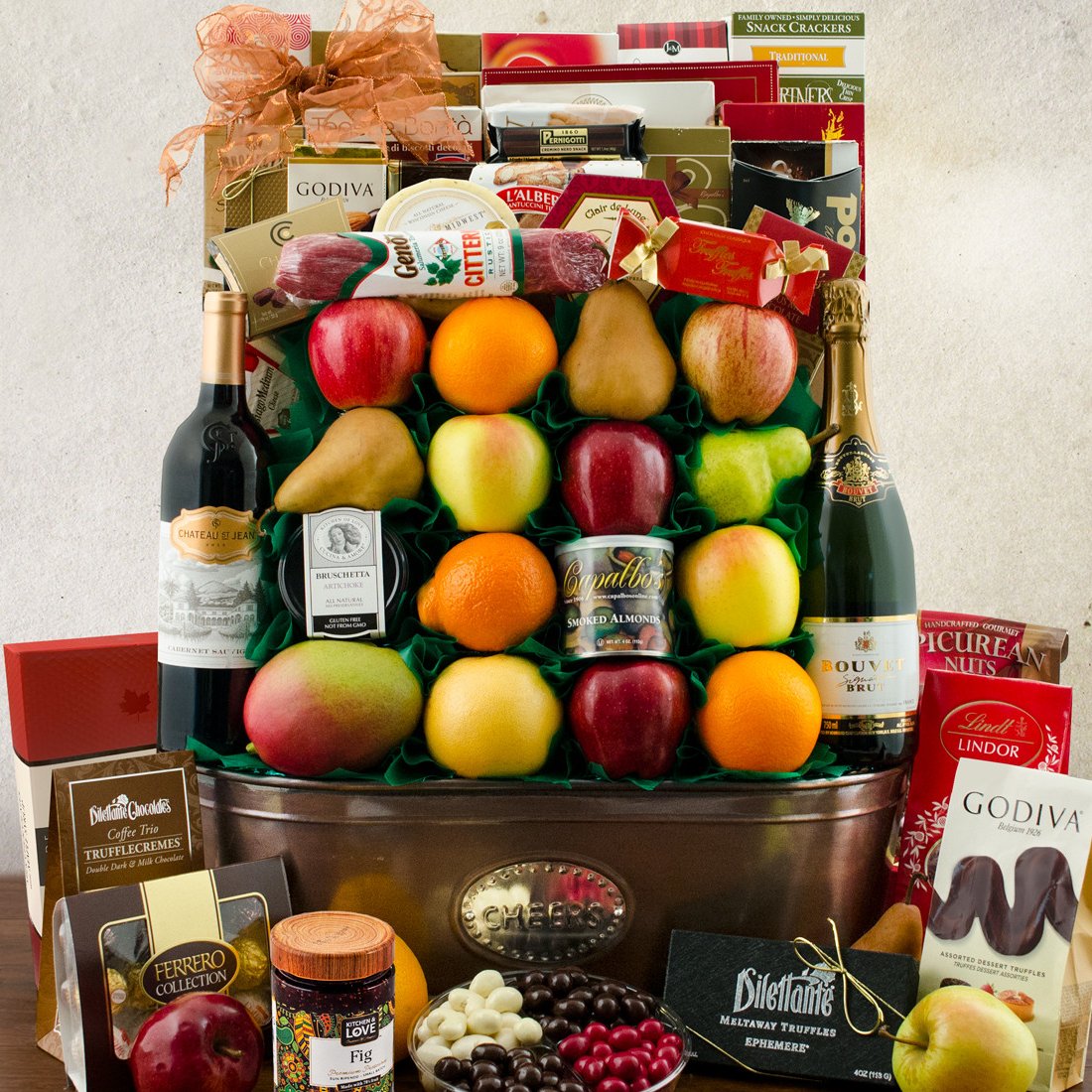 A fantastic arrangement fit for royalty with Chateau St Jean Cabernet Sauvignon red wine, Bouvet Signature Brut French white sparkling wine, 18 pieces of farm fresh fruit and enough gourmet delights to feed the entire kingdom!